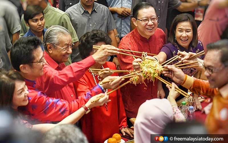 Dr Mahathir Mohamad (3 dari kiri) menggaul yee sang bersama Anwar Ibrahim (kanan) dan Lim Guan Eng (3 dari kanan)
