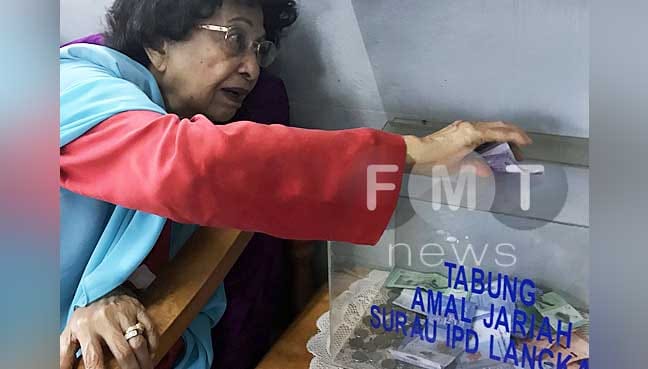 Tun Dr Hasmah Mohd Ali, isteri bekas perdana menteri dan calon PH bagi Parlimen Langkawi, Tun Dr Mahathir Mohamad, memasukkan sumbangan ke dalam peti derma yang disediakan di Ibu Pejabat Polis Langkawi. Beliau berhenti rehat di situ dalam perjalanan ke pusat penamaan calon.