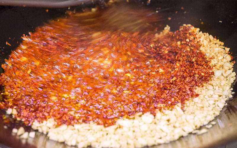 Kacau untuk menggoreng bawang putih sehingga menjadi sedikit perang kira-kira 8 hingga 9 minit atau minyak mencapai suhu 130°C. Kikis bahagian tepi dan bawah kuali sekali sekala supaya tiada yang melekat.