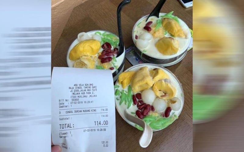Baru-baru ini tular di media sosial apabila seorang pengguna berkongsi sekeping gambar menunjukkan resit pembelian bagi 3 mangkuk cendol durian Musing King dengan tertera harga RM114.