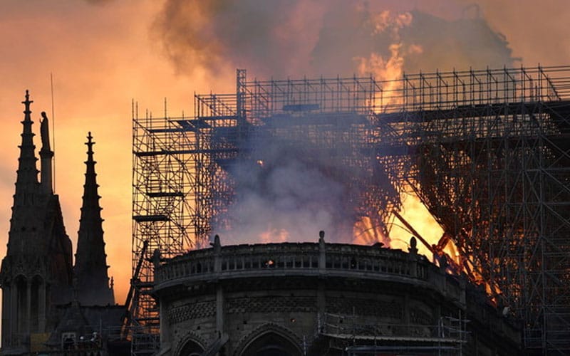 Rakaman visual online menunjukkan asap tebal menyelubungi bahagian atas katedral itu manakala nyalaan besar kelihatan antara 2 menara locengnya menelan puncak menara dan keseluruhan atap, yang kemudian runtuh.