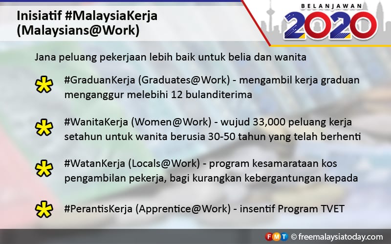 * #WanitaKerja (Women@Work) bertujuan mewujudkan 33,000 peluang pekerjaan setahun untuk wanita berusia di antara 30 hingga 50 tahun yang telah berhenti bekerja selama setahun atau lebih. Wanita yang kembali bekerja akan diberi insentif gaji selama dua tahun sebanyak RM500 sebulan, manakala majikan pula akan diberi insentif pengambilan pekerja sebanyak RM300 sebulan dalam bagi tempoh yang sama. Sebagai tambahan, pengecualian cukai pendapatan bagi wanita yang kembali bekerja akan dilanjutkan empat tahun lagi sehingga tahun 2023.