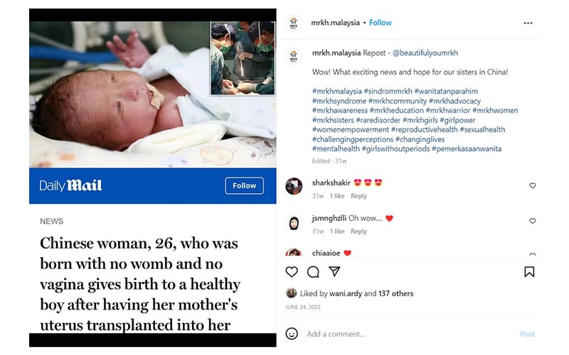 Menurut Wani, pembedahan pemindahan rahim berjaya membantu wanita MRKH memiliki zuriat sendiri di Amerika Syarikat, India, Turki dan Sweden menerusi kaedah persenyawaan luar rahim (IVF).