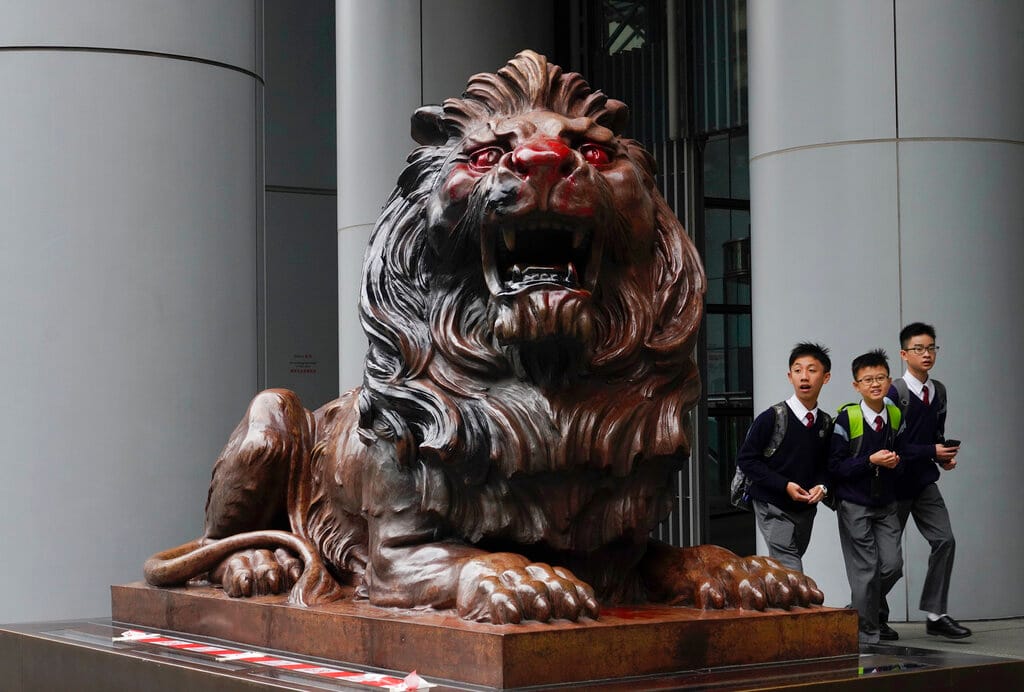 HSBC was briefly caught up in anti-government protests in Hong Kong during past months, when some of its branches were vandalised and its famous bronze lions graffitied during a protest march on Jan 1.