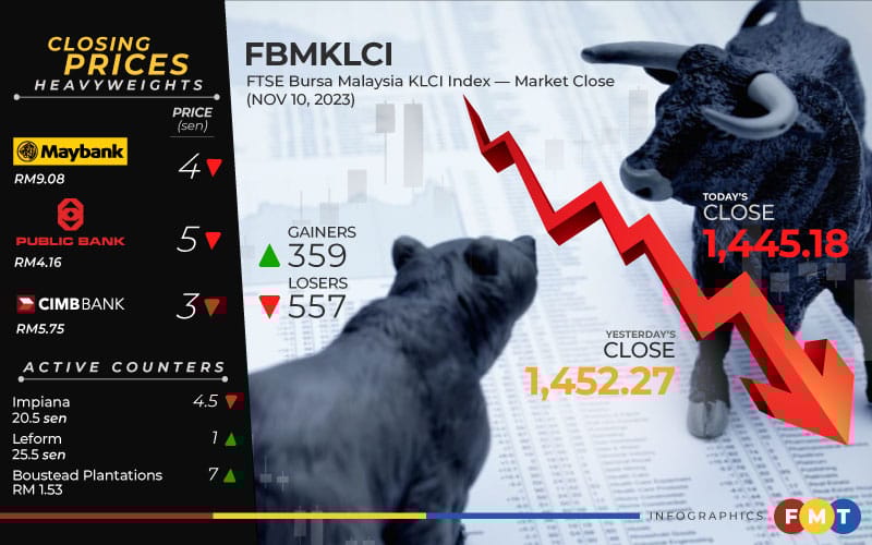 At 5pm, the FBM KLCI fell by 0.48%, or 7.09 points, to close at 1,445.18 from yesterday’s closing of 1,452.27.