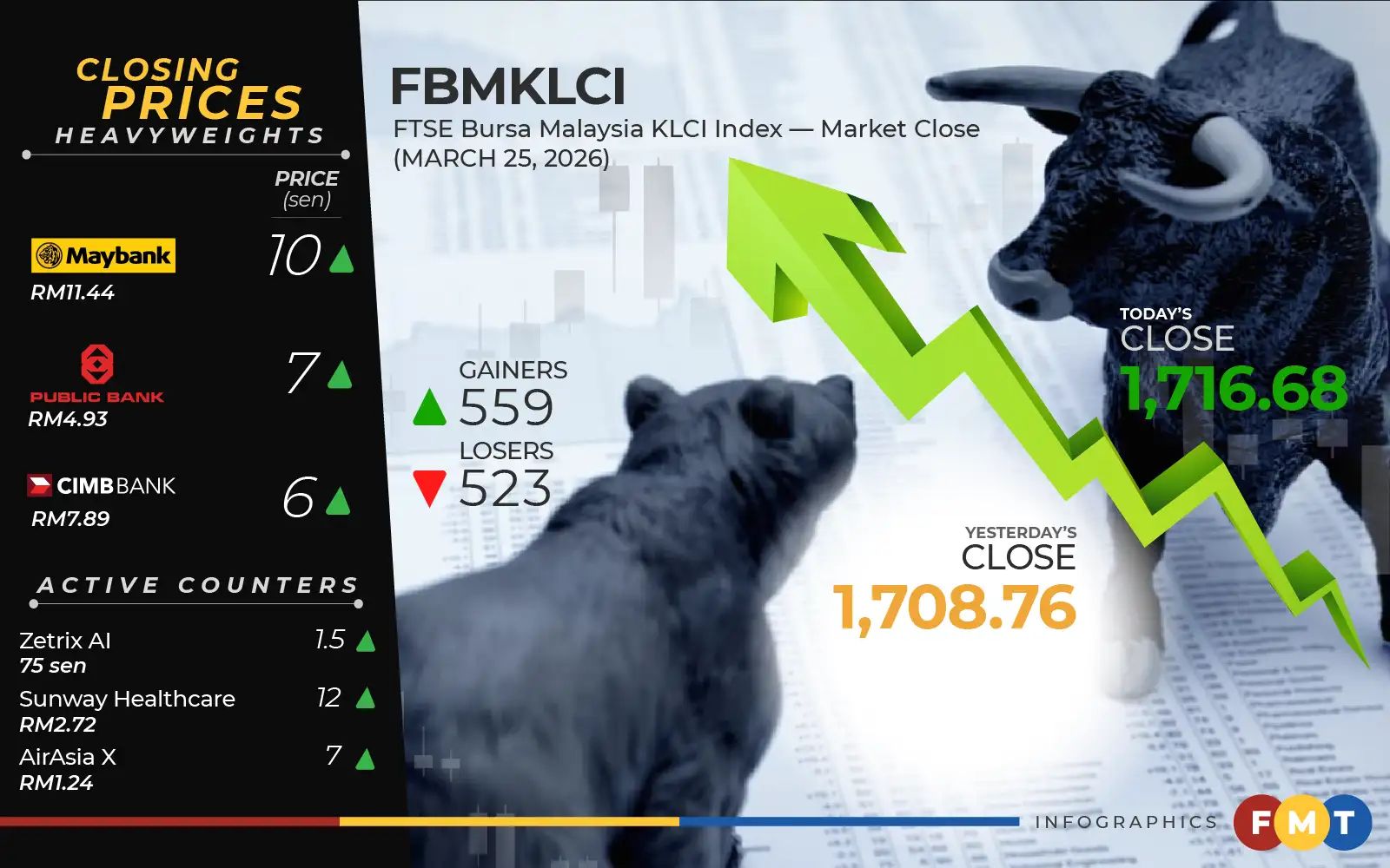 At 5pm, the FTSE Bursa Malaysia KLCI (FBM KLCI) increased 7.92 points or 0.46% to 1,716.68 from yesterday’s close of 1,708.76.