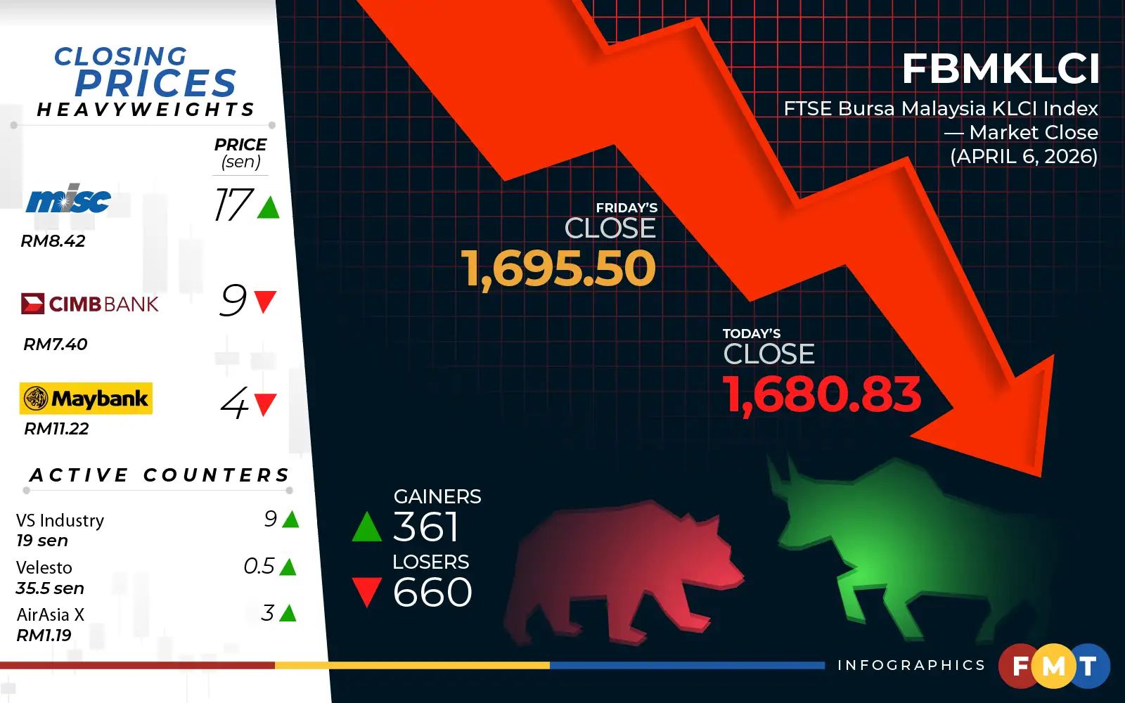 Rakuten Trade Sdn Bhd vice-president of equity research Thong Pak Leng said the FTSE Bursa Malaysia KLCI (FBM KLCI) fell to its 1,680 key support level, signalling weakening near-term sentiment as selling pressure persists.