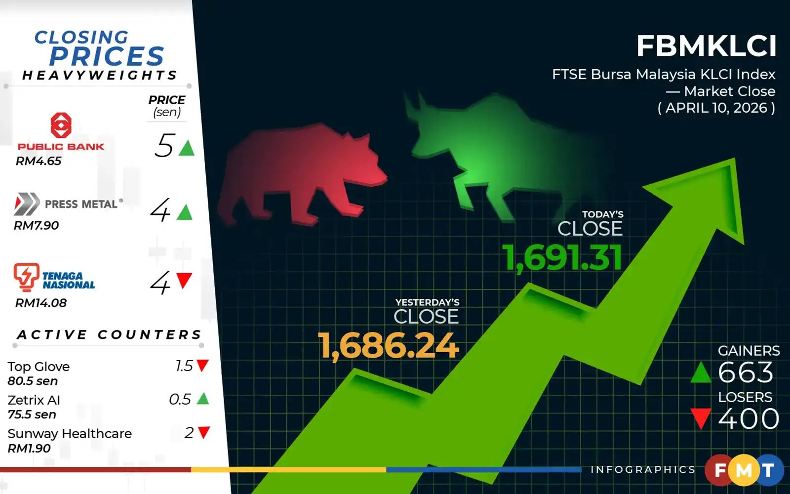 At 5pm, the FTSE Bursa Malaysia KLCI (FBM KLCI) gained 5.07 points, or 0.30% to 1,691.31 from yesterday’s close of 1,686.24.