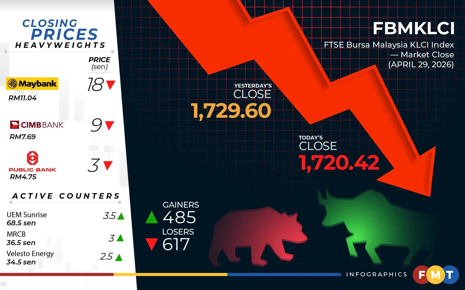 At 5pm, the FBM KLCI fell 9.18 points, or 0.53%, to 1,720.42 from yesterday’s close of 1,729.60.