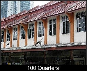 The neighbouring streets of Jalan Rozario, Jalan Chan Ah Tong and Lorong Ah Tong are lined with neat rows of terraced housing known collectively as The Hundred Quarters.These 100 houses were built in 1915 for civil servants (some sources say railway employees), who were brought over from India by the British.