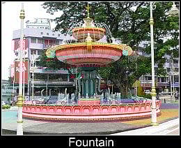 The makeover of this area included the construction of an elaborate fountain supported by elephant statues, a grand entrance archway, brightly coloured pavements, ornate street furniture and a gaudy paint job on the buildings lining the two main streets. The overall effect is quite distinctive and pleasing.