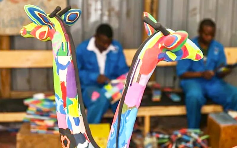 Plastic insulating Styrofoam salvaged from dumped refrigerators is used as a mould for larger works, including elephants and towering giraffes that can sell for many hundreds of dollars.