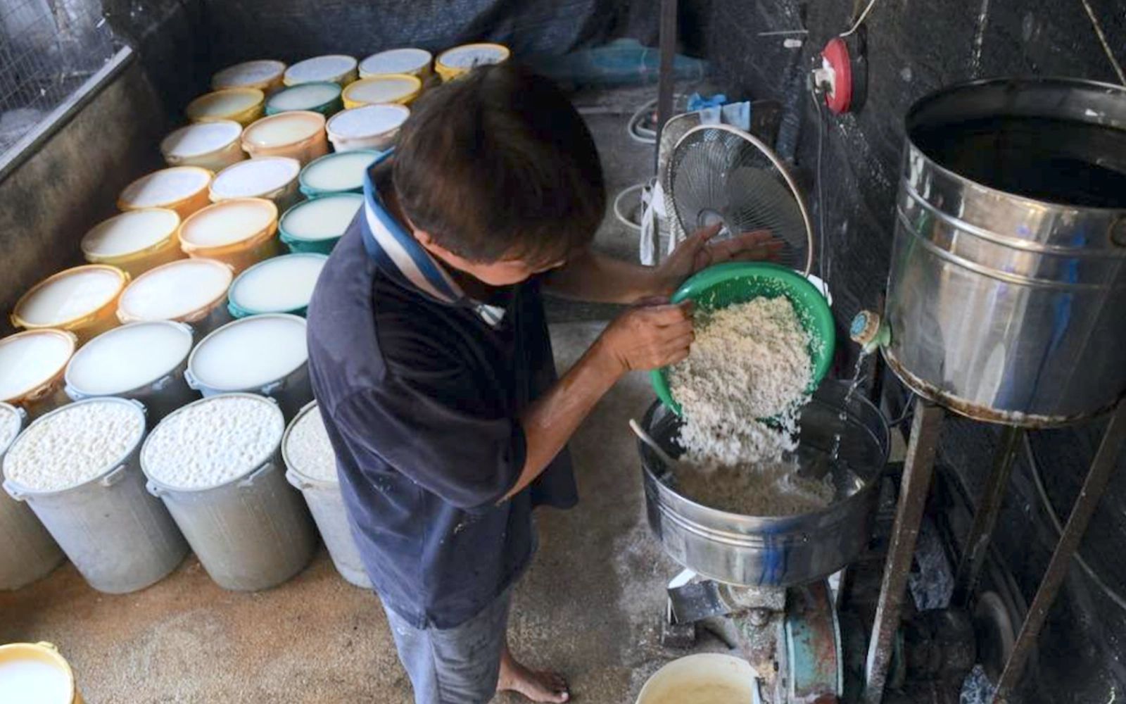 Crushed rice is soaked and fermented for about a month, with the water changed daily. It is then ground into a paste, filtered and shaped by hand into small pellets before being left to dry under the sun.