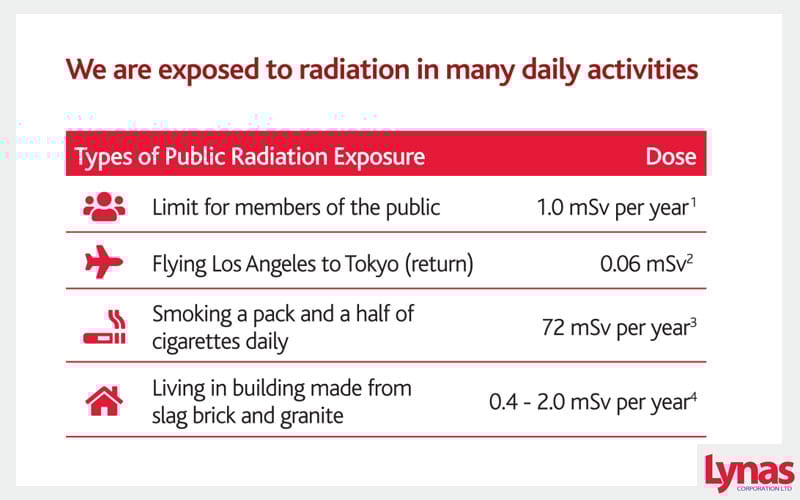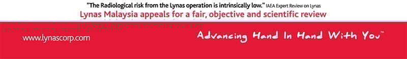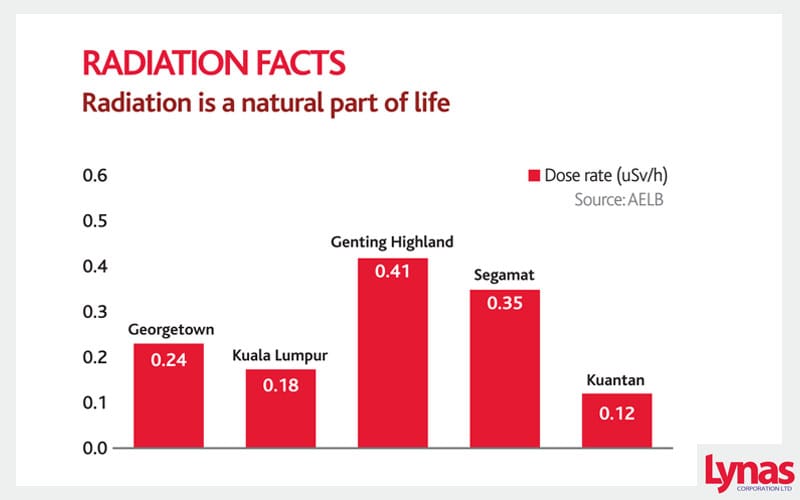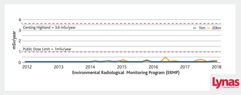 There has been no increase in background radiation levels in the 6 years that Lynas has operated. Environmental radiation and radioactivity monitoring of water, air, soil and sediments samples at 1 km, 5 km, 10 km and 20 km from the Lynas plant are conducted in accordance with internationally accepted sampling and monitoring methods. 44 monitoring activities over more than 5 years have been carried out by a 3rd party accredited consultant. Similar monitoring programs are conducted by the AELB independently.