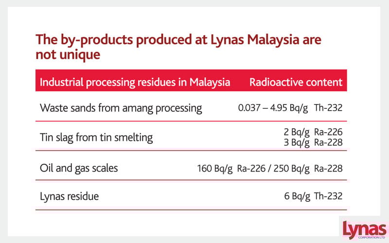 Rare Earths deposits are generally found alongside naturally occurring radioactive elements. The radioactive material is not enhanced during the separation and refining process. Lynas Malaysia is NOT a nuclear plant and does NOT produce nuclear waste.