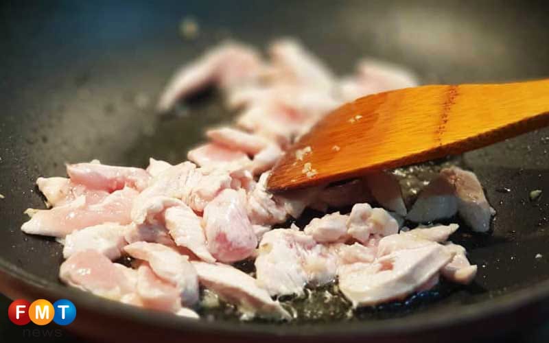 Tumis ayam yang telah didadu bersama bawang putih sehingga ayam separuh masak.