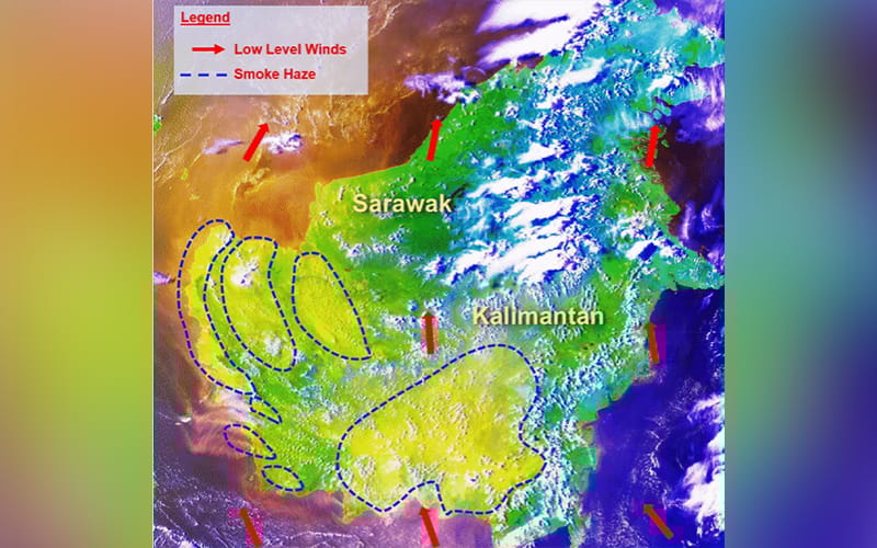 “Widespread moderate to dense smoke haze was observed over southern parts of Kalimantan as a result of build-up of smoke haze from persistent hotspot clusters in South and Central Kalimantan. In West Kalimantan, scattered hotspots continued to emit moderate to dense smoke haze, which has been blown by the prevailing winds to affect western Sarawak.”