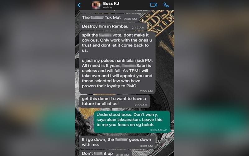 The alleged screenshot of messages purportedly from Khairy made the rounds online, with a person named “Boss KJ” using expletives and telling the recipient of the texts to “destroy” Mohamad in Rembau.
