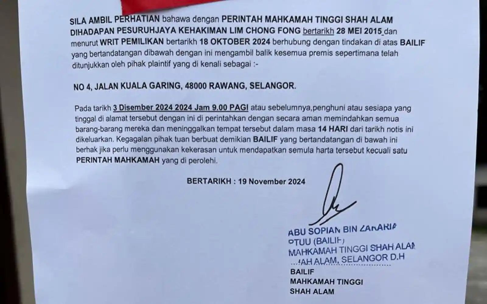 His family has obtained a stay order from the Shah Alam High Court to stall their eviction.