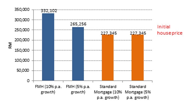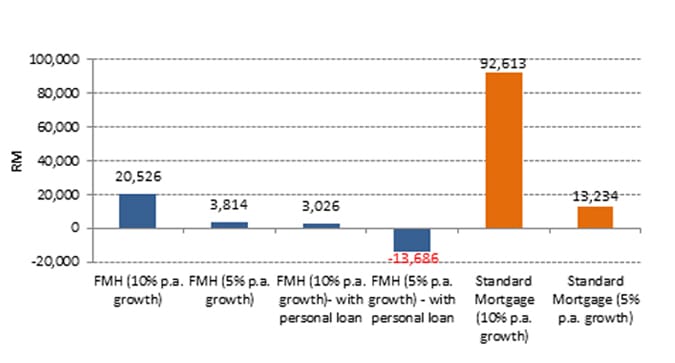 This additional debt figure rises to a staggering RM104,757, relative to a standard mortgage if the annual home value appreciation rate is 10% per annum.