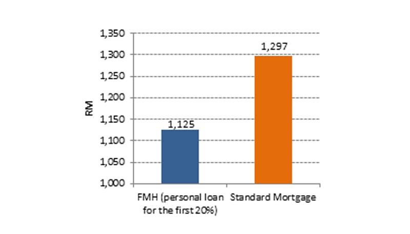 Should buyers raise funds through personal loans to pay the initial 20% (RM50,000), their monthly repayment will be roughly RM1,125, which is just RM172 less than that which is required from a standard mortgage repayment scheme (Figure 2).