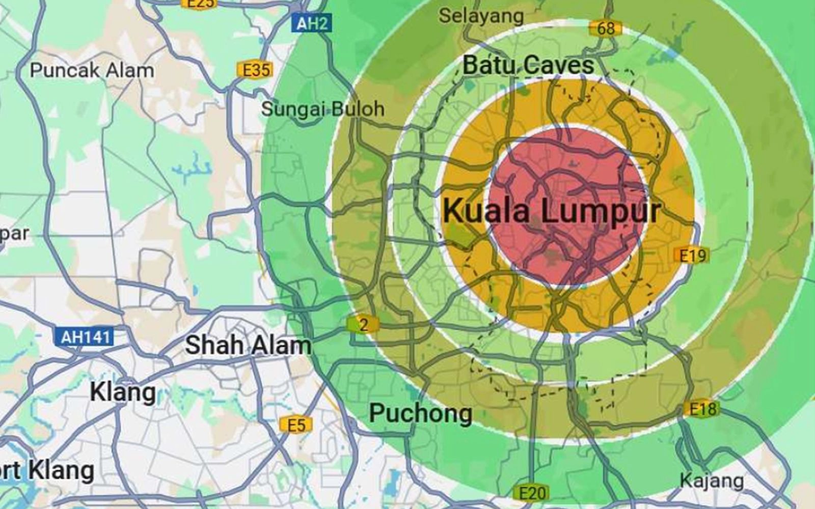 The first ring is around KLCC, the core of this narrative. Each ring is about 5km wide; we have five rings, starting from around Puchong.