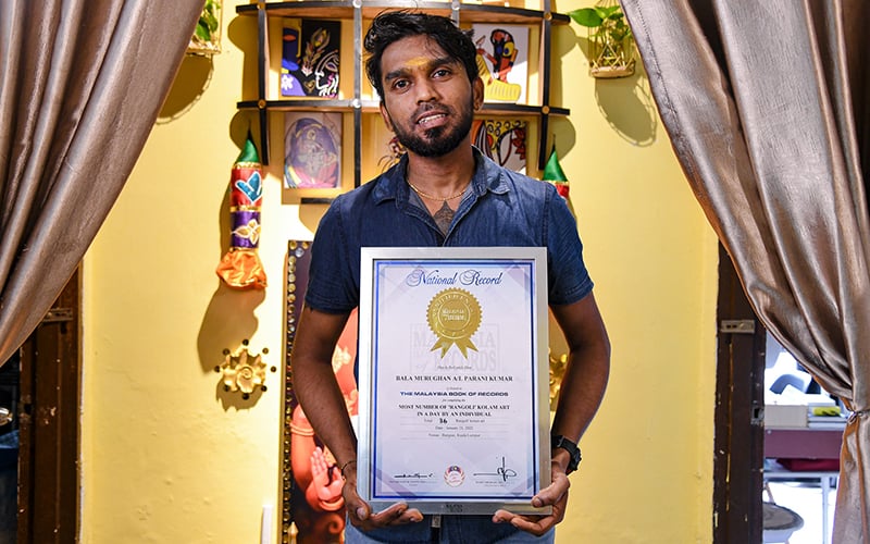 Bala Murughan makes it into the Malaysia Book of Records for most kolams drawn in one day.