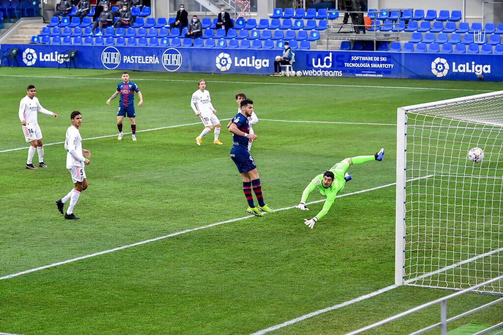 Huesca would have regained the lead had Mir’s bullet header not been superbly saved by Courtois and Madrid pushed for a winner, Marcelo and Benzema both going close.
