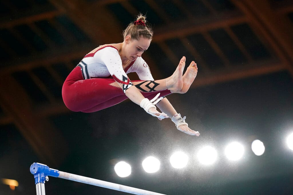 The team, composed of Sarah Voss, Pauline Schaefer-Betz, Elisabeth Seitz and Kim Bui, opened their Olympic performance on the asymmetric bars wearing red and white unitards, which are combined leotards and leggings extending to the ankles.