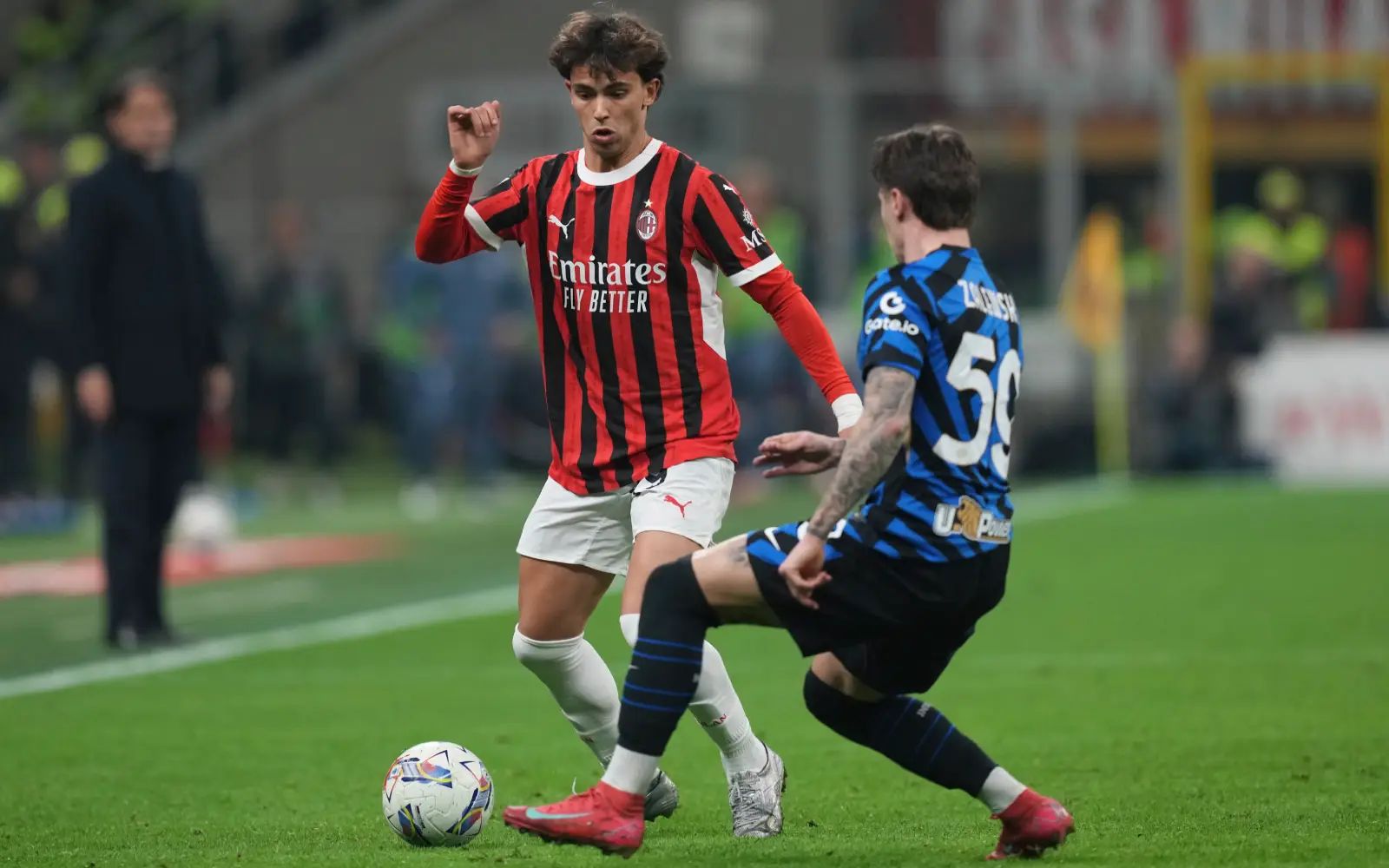 Rafael Leao had an excellent chance to put Milan ahead after 26 minutes, with Inter keeper Josep Martinez saving his shot from a tight angle, while Calhanoglu put Milan’s Mike Maignan to work with a thunderous free kick.