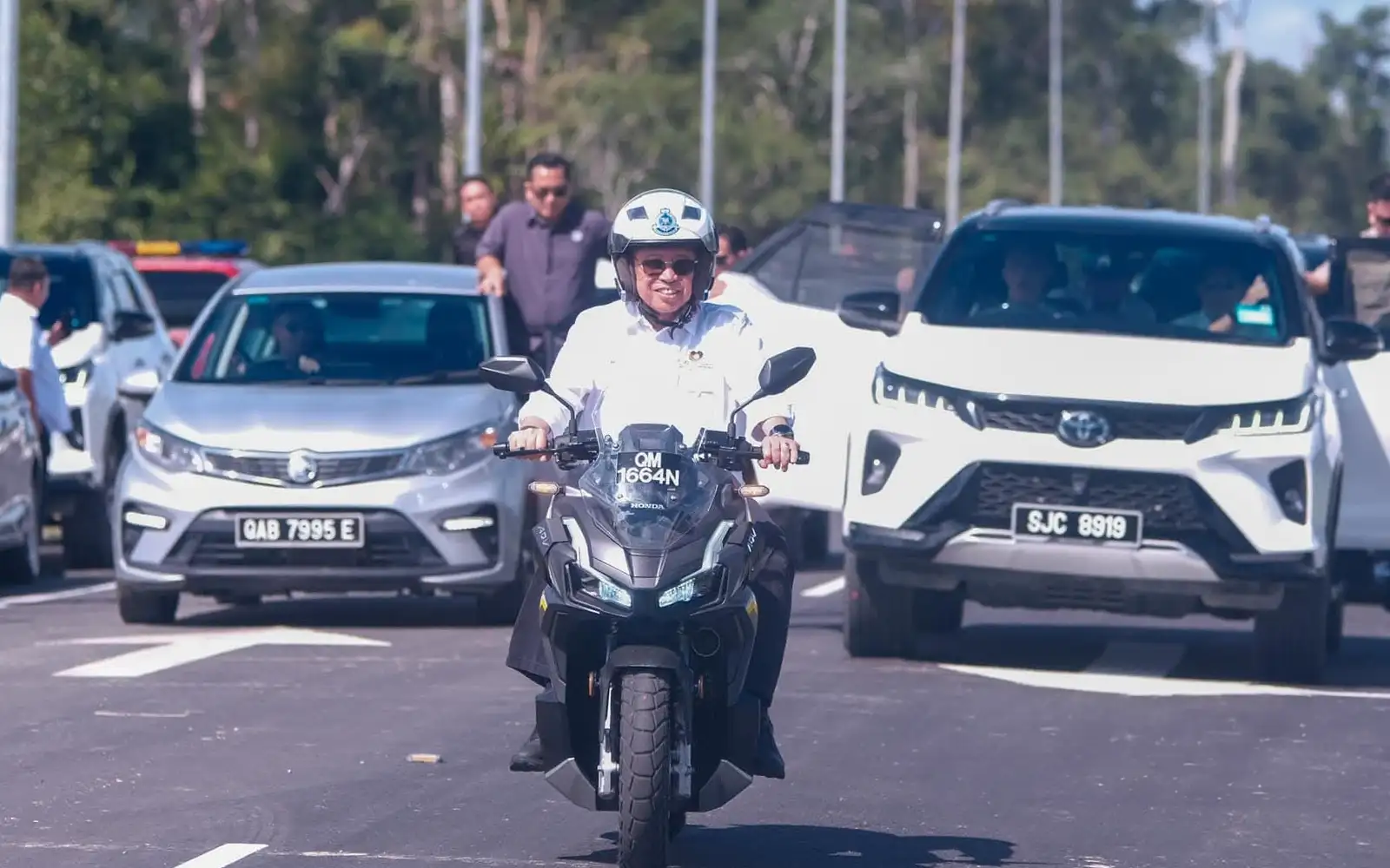 Abang Jo borrows police bike to cross Baram river on new bridge