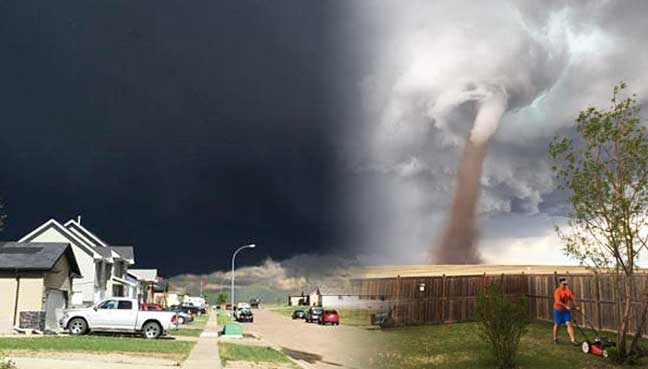 Lelaki tenang potong rumput ketika pusaran puting beliung