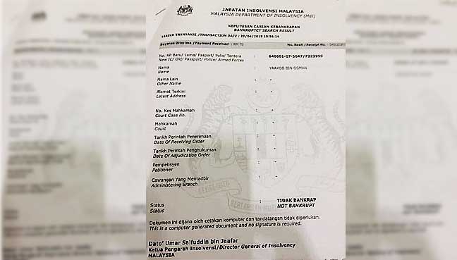 Surat rasmi sahkan Yaakob tidak bankrap