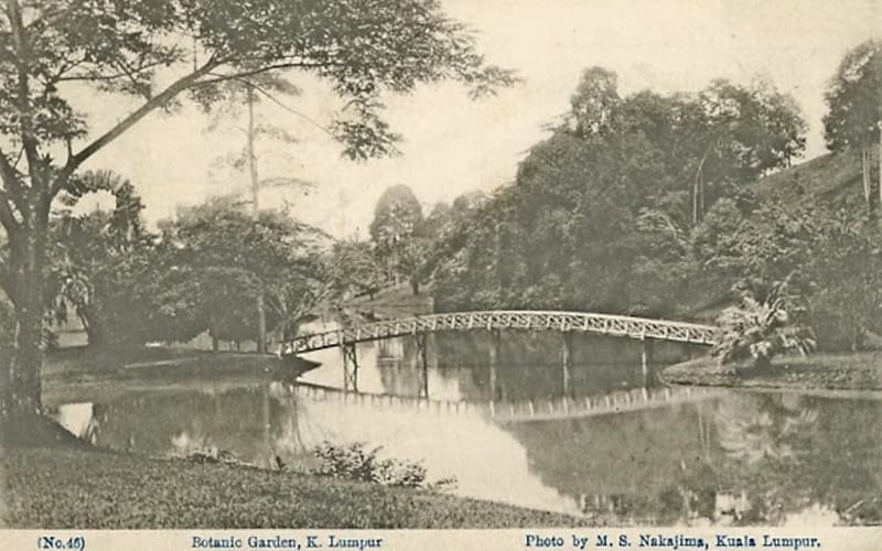 The following postcard of the Botanic Garden in Kuala Lumpur is postmarked 1915, which means it was taken more than 100 years ago. The garden still exists, of course, and the view is similar today – only the wooden bridge has been replaced by a termite-proof concrete one.