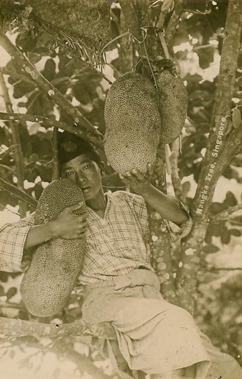 This vintage postcard shows a boy in a jackfruit tree. Although the caption says “Singapore”, the photo might not have been taken on Singapore island – it was the capital of the Straits Settlements at the time, and many postcards of what is now Malaysia were given the caption Singapore. (Et tu, National Geographic?)