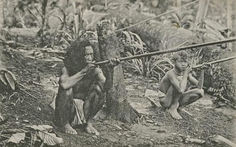 This postcard, which was printed in Italy, bears the caption “Wild Sakei – Perak – Malay Peninsul. 1.a Serie Cerruti” (sic), and shows an Orang Asli man and boy with blowpipes.