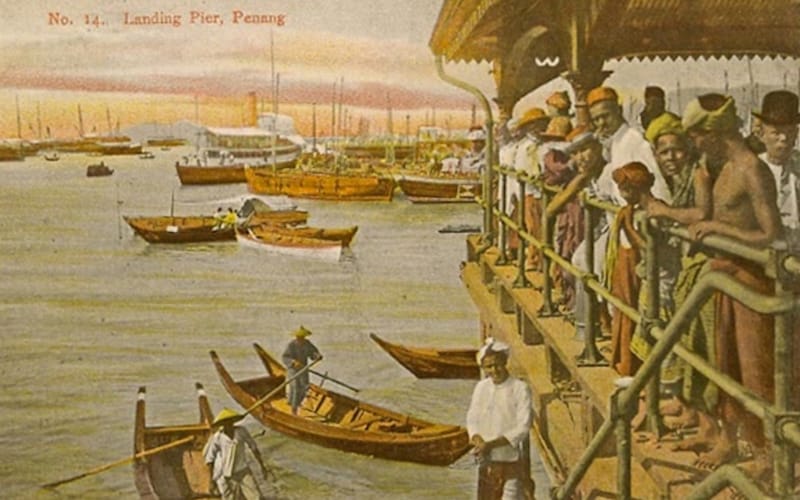 This colour postcard depicts newly arrived Indian migrants at Victoria Pier, where sampan await to ferry passengers.