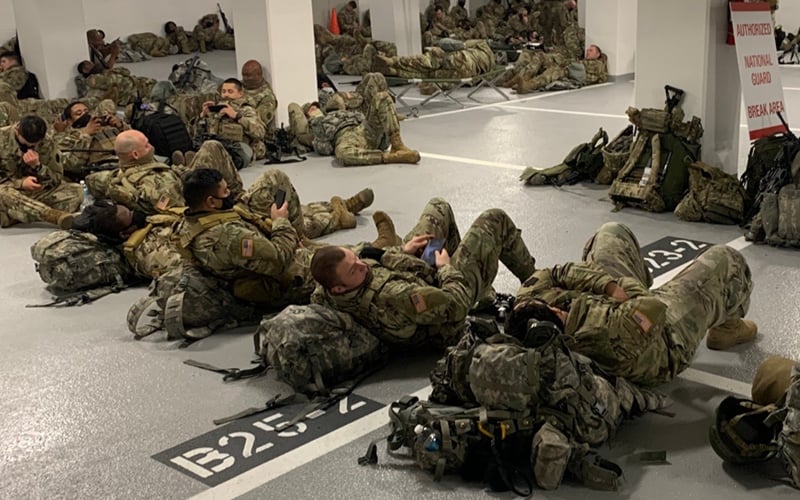 A number of the 25,000 troops standing guard around the US Capitol in recent days in the wake of the Jan 6 insurrection had been allowed to take breaks and naps in between long shifts on the floors of the building housing the US Congress.