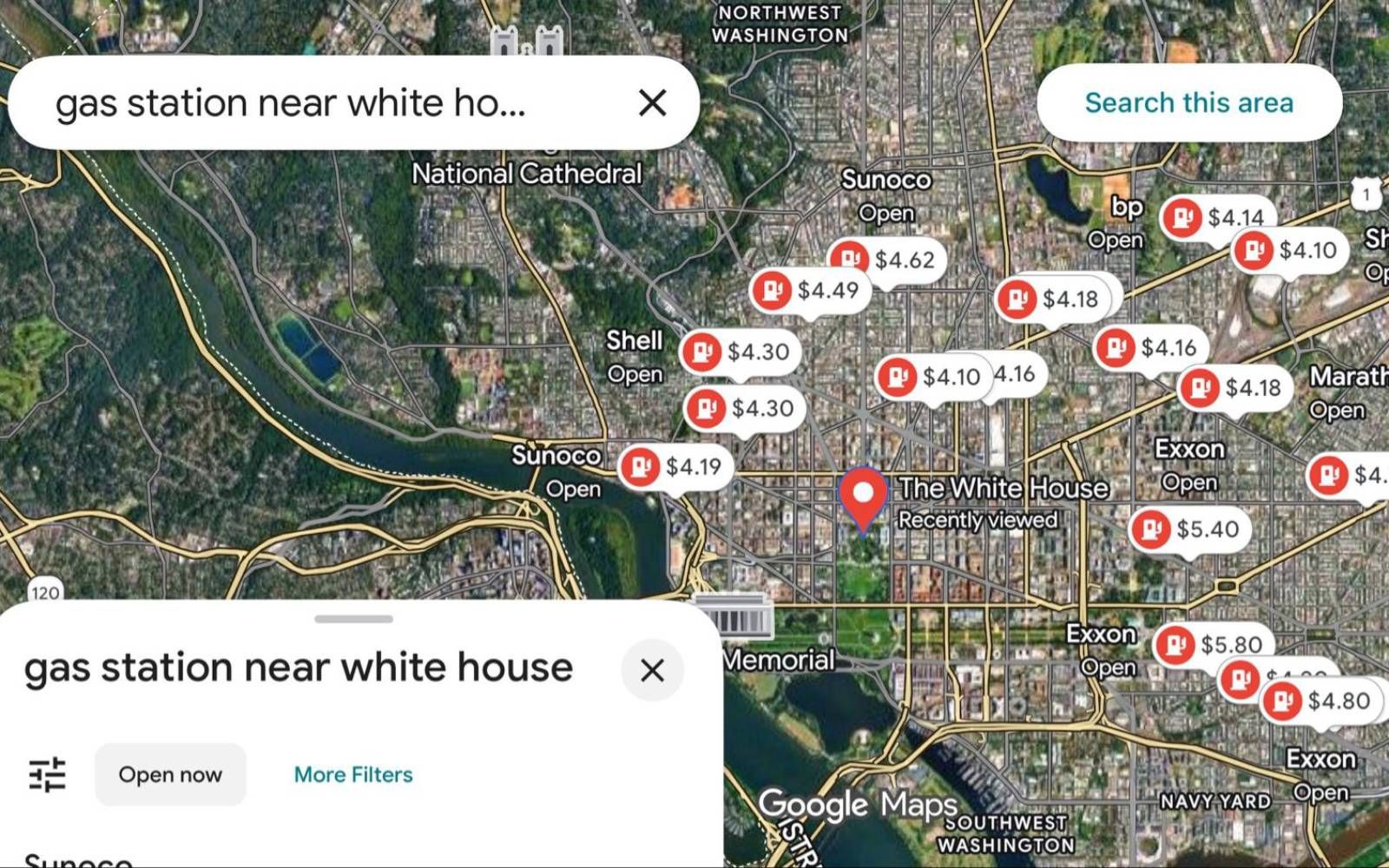 He attached a screenshot showing gasoline prices at stations near the White House ranging between about US$4.10 and US$5.80 per gallon.