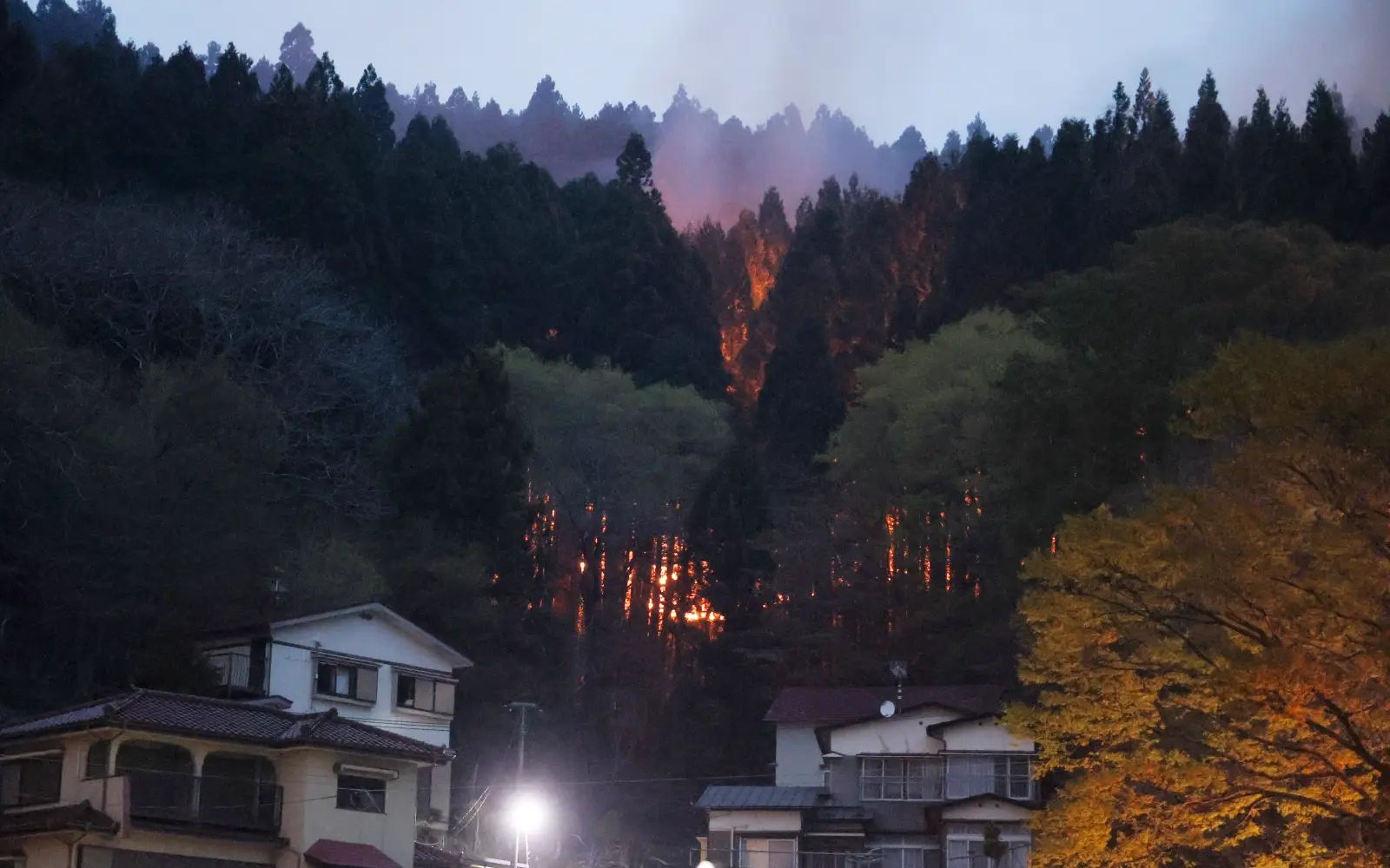 “The sound was crazy. All these cedar trees were cracking as they burned, sending flames and smoke soaring,” a local firefighter told major broadcaster TV Asahi.